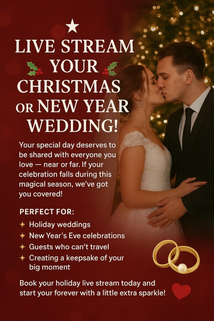 Whether you’re saying “I do” under twinkling Christmas lights or welcoming a brand-new year as newlyweds, we can bring your ceremony to friends and family anywhere in the world with a beautiful, high-quality live stream.